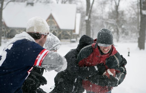 While the big bird roasted in the oven, we went out on our parcel of land where the suburbs meet the farmlands under the wide-open Midwestern sky—blue and fragile like porcelain with the sun shining down on brilliant, sparkling snow—and we taught the Russians how to play football. The teams were six-on-seven. There was Stas and his friend Anton from Leningrad and the twins Anton was staying with. There was my high school buddy Joe and his brother and my brother and two of his friends and a future brother-in-law. We offered up tips as we struggled through knee-deep powder for an end run: forward pass and lateral and tackle the receiver before he scores.